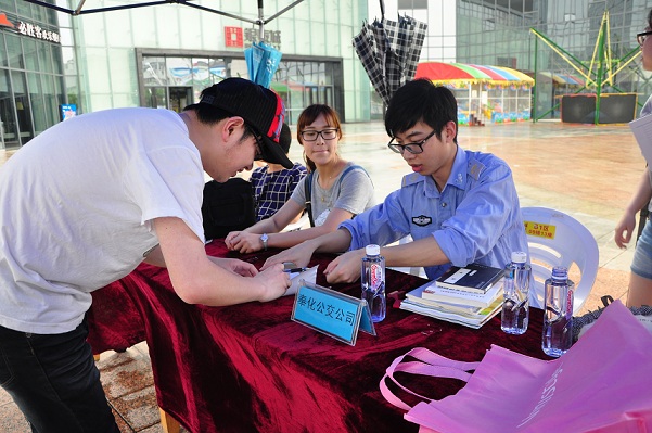 由奉化团市委联合市慈善总会义工分会、市图书馆、三味书店、市公交公司等单位共同主办的我市首个“爱心图书银行”活动在银泰广场正式启动。书香奉城,传递爱心,该活动受到市民的积极响应,纷纷拿出家里闲置的书籍存入“爱心图书银行”,成为“爱心储户”,凭借“捐赠证书”即时实现闲置图书二换一活动,将闲置的图书流动起来。各单位均在活动现场设置了摊位,办理图书捐赠登记及置换手续。