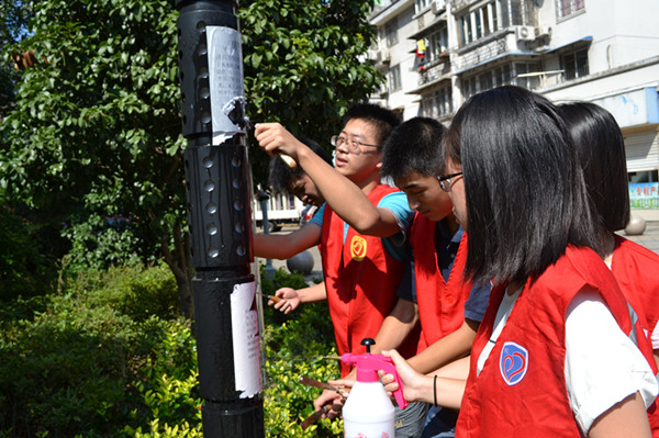 顶着烈日,冒着炎炎酷暑,志愿者们拿了喷壶、铲子、刷子,提着涂料,用手撕,用喷壶喷,用铲子铲,将小广告清除一光,将成片成片令人“眼晕”的牛皮癣一扫而光,还给居民百姓一个“清洁的世界”。受到志愿者的感染,青少年也加入到活动中来,受到居民的称赞和家长的支持。