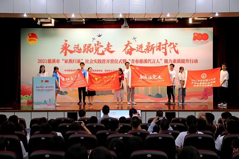 仪式上,为“家燕归巢”大学生社会实践营授旗,8名“小家燕”代表分享了他们在实践岗位的感悟。“如何把一篇气象推文在有限的时间内做的既准确又美观,就是我每日不断研究的‘课题’。每当看见慈溪气象公众号下有用户评论今天的气象预报风趣幽默,我就感到由衷的喜悦。”来自内蒙古大学汉语言文学专业胡凝霜分享了她在市气象局融媒体编辑实习岗位上的感悟。来自北京大学、浙江大学、同济大学、华东理工大学、上海外国语大学、宁波大学科技学院等高校的实践团队也在仪式上集体亮相,并举行了展旗仪式,他们将奔赴慈溪各地开展社会实践。